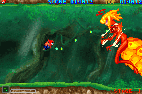 The three stages culminate in challenging boss encounters that test both your reflexes and your mastery of the weapons at hand. Each boss has a distinct attack pattern, sprawling across the screen with elaborate bullet spreads that force you to learn safe zones and timing windows. Because you only have three lives and no continues, these bosses can feel like epic gauntlets, demanding near-flawless play to progress. The brief burst of invincibility and maxed-out firepower you receive upon respawning provides a helpful adrenaline rush—but does little to dull the sting of losing your precious lives.