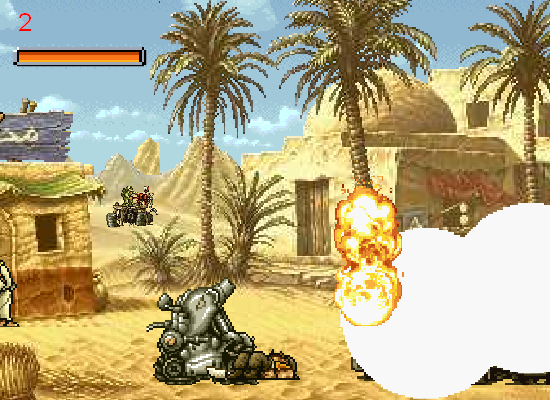 Visually, Metal Slug Rampage! 2 strikes a balance between nostalgia and polish. The pixel art is vibrant, featuring detailed backgrounds—crumbling ruins, dusty highways, and lush palm trees—that evoke the game’s Middle Eastern setting. Animations are smooth, with explosive effects punctuating every direct hit and enemy demise.
