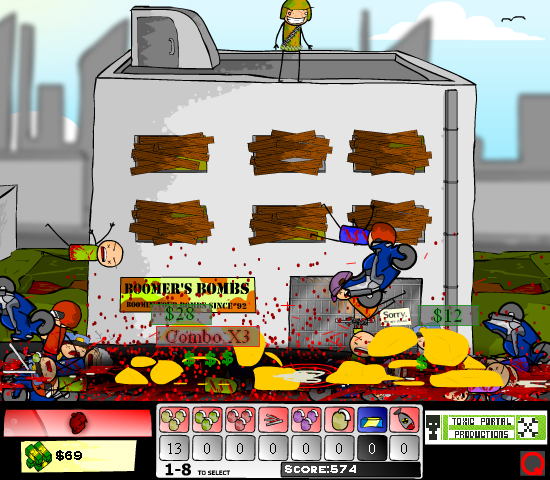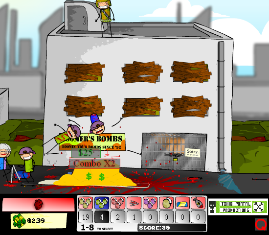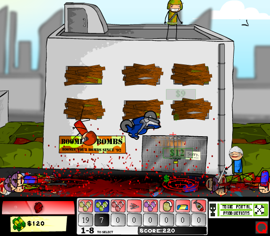Between levels, players spend their hard-earned cash on new explosives and health pills to stave off Boomer’s fatal heart attacks. The lack of a strict timer encourages experimentation—try out a grenade combo or mix in Landmines with Super Grenades for chaotic chain reactions. At the same time, you must prevent too many civilians from slipping by; let the heart meter fill, and it’s game over. This risk-reward system adds a constant strategic tension that keeps each stage engaging.