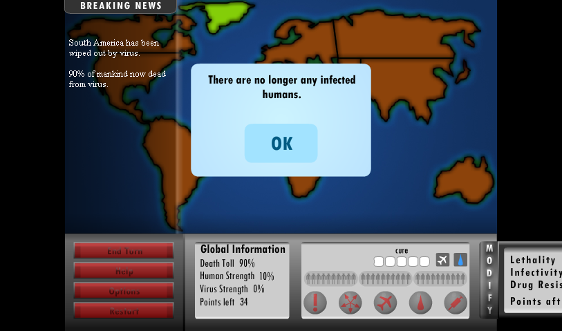 The game’s strategic depth lies in how you balance expansion against defense. Ramp up Infectivity to seed outbreaks in new regions, then hoard points into Drug Resistance as national governments race to slow your advance by funding medical research. If you prefer a direct approach, you can spend points to launch a targeted assault on a country’s laboratories, delaying the cure project or even temporarily reversing its progress.