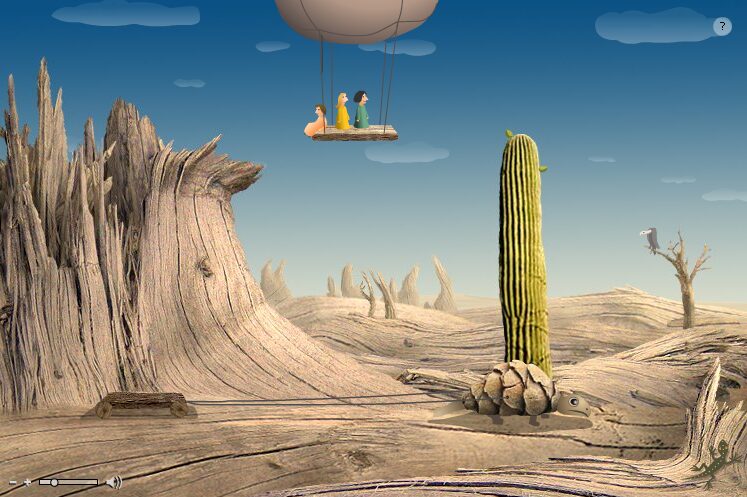 Visually, the game channels the same surreal, hand-painted charm that made Samorost’s landscapes so memorable. Each biome—desert, forest, and ocean—is rich with detail, from swirling sand dunes dotted with mechanical cacti to towering trees festooned with glowing orbs. The color palettes are lush and vibrant, reflecting the music’s uplifting gospel-rock energy. Small animated flourishes—a frog’s bulging eyes, a waving seaweed patch, the gentle sway of an airship’s propeller—breathe life into every screen.