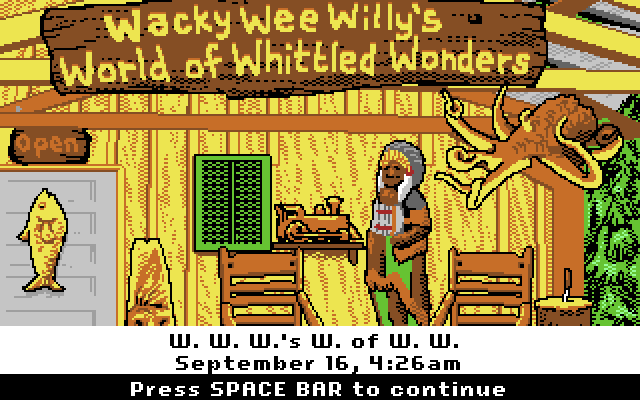 Mini-games maintain consistency with the main title’s retro vibe, using the same palette and sprite style. The snowboard competition features downhill slopes in bright, icy blues, while the Green River paddling segment uses watery aqua tones that shimmer between frames. Even the hunting mini-game’s fast-food targets—pixelated burgers and tacos—pop against the otherwise monotone backgrounds.