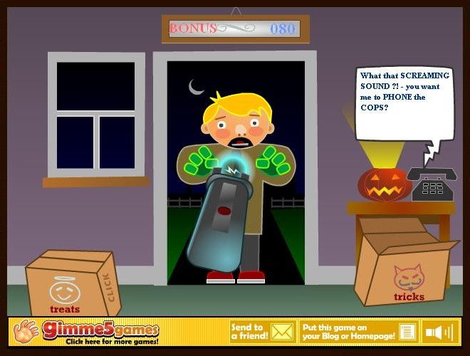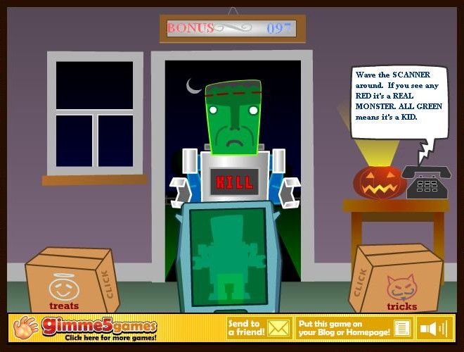 Trick or Treat XTreme hinges on a deceptively simple yet surprisingly tense mechanic: scanning every visitor at your doorstep and deciding whether to treat or trick. The moment you hear the doorbell, a frantic click of the mouse answers your door, and the real challenge begins. You must hover the scanner over the visitor until color-coded signals appear—green for kids, red for ghoulies—then click the appropriate box. Each correct choice racks up points, while a single mistake brings an abrupt and brutal end to your night.