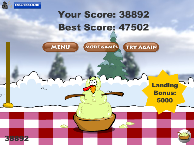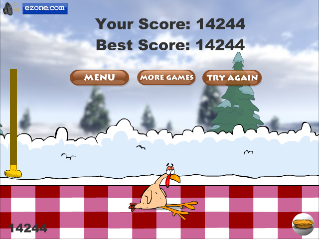 Turkey-Xmas refashions the familiar fling-and-flap mechanics of Turkey-Fling into a festive holiday romp. You begin each run by launching your turkey across a snowy table, then holding down the mouse button to flap your wings and gain altitude. It’s a simple premise, yet the timing and meter management create a surprisingly strategic experience that keeps you engaged from the very first attempt.