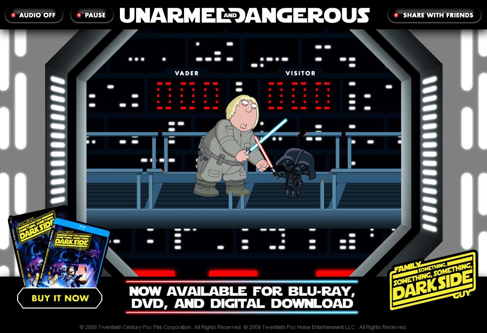 Visually, Unarmed & Dangerous stays true to the signature style of Family Guy’s 2D animation. Character sprites are clean and instantly recognizable—Chris’s sandy hair and Vader’s helmet silhouette pop against the minimalist backdrop. The dismemberment is cartoonish rather than grisly, with bright, exaggerated limb outlines that fit the show’s irreverent humor without venturing into shock territory.