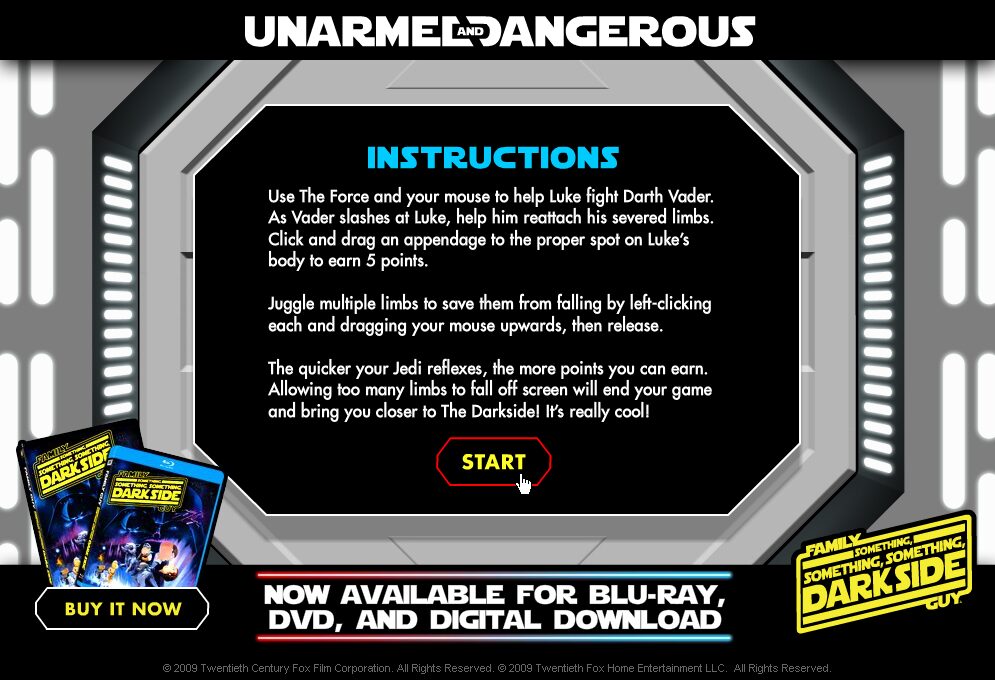 Unarmed & Dangerous delivers a delightfully chaotic gameplay loop built around one simple premise: reattach Chris Griffin’s (Luke Skywalker) dismembered limbs faster than Stewie Griffin (Darth Vader) can slice them off. Players control a floating Force cursor that must drag each severed hand, arm, shoulder, leg, or foot back onto the body before it drifts out of reach. Every successful reattachment nets five points, encouraging a frantic rhythm of slicing and sticking that ramps up in intensity as more limbs fly free.