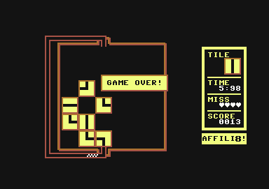 Developed for the 2K size category of the Mini Game Competition, Affili8! boasts a crisp, no-frills visual style. The 6×6 playfield is neatly rendered, with each pipe fragment clearly distinguishable by color and shape. There’s no attempt at flashy effects—everything is designed to be instantly readable, which is exactly what a puzzle game needs when split-second decisions can mean the difference between victory and a “Game Over.”