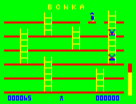 Visually, Bonka embraces a retro aesthetic that pays homage to its arcade roots. The sprites are clean and well-defined, with vivid colors that pop against the dark platform backdrops. Despite hardware limitations likely influencing the design, the overall presentation feels polished rather than dated. Each Meanie has a distinctive silhouette, making it easy to distinguish between threats even when several appear on screen.