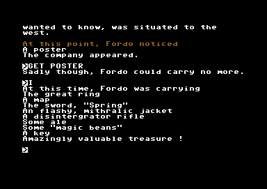 Bored of the Rings delivers an interactive fiction experience that leans heavily on classic VERB NOUN commands. As Fordo the Boggit, you’ll type simple directives like “TAKE RING” or “GO NORTH” to navigate the featureless plain below the pink mountain, barter with Lake Anadin fishers, or sneak past the Land of the Personal-Stereo-Wearing Goblins. This straightforward parser means there’s virtually no learning curve, making the game accessible even to those who’ve never tangled with text adventures before.