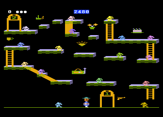 Bounty Bob Strikes Back! builds upon the classic platforming foundation laid by Miner 2049er, offering 25 intricately designed mine levels that require both precision and strategy. Each stage is a puzzle in itself: you must traverse every segment of the framework, leaving no platform unvisited. The core mechanic—walking over tiles to claim them—remains simple to grasp, yet becomes increasingly complex as you juggle ladders, slides, suction tubes, cannons, and transporters. Each device adds a new wrinkle to your approach, forcing you to quickly learn how to chain jumps and climbs in the most efficient order.