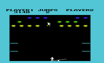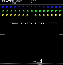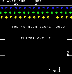 Circus takes the classic paddle-and-ball formula and gives it a whimsical spin by swapping bricks for colorful balloons and paddles for a seesaw operated beneath a leaping clown. Instead of breaking through layers of blocks, you must time your seesaw movements to launch the clown skyward into clusters of balloons. Precision and timing are crucial: too early or too late and your clown will miss his target, costing you one of your precious jumpers.