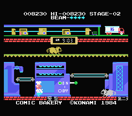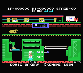 Comic Bakery presents a fast-paced blend of time management and arcade action, tasking players with the unique challenge of baking loaves of bread while fending off mischievous raccoons. As pieces of dough travel along the factory conveyor, you must toggle machinery, maintain the correct baking temperature, and ensure the production line never grinds to a halt. The raccoons add a layer of chaos by gnawing on fresh loaves and attempting to flip off switches, forcing you to juggle resource management with quick reflexes.