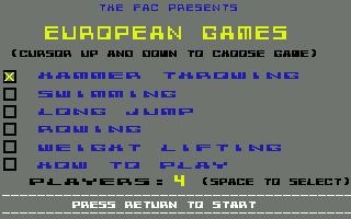 The game’s enduring appeal lies in its simplicity and competitive spirit. It captures the feel of athletic contests without unnecessary complexity, making it easy for newcomers to jump in while still rewarding practice and finesse. For retro gaming enthusiasts and fans of classic sports simulations, European Games offers a charming, well-paced experience that remains engaging decades after its release.