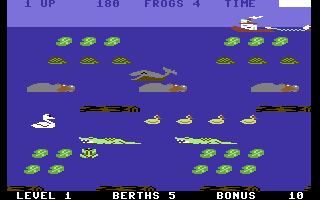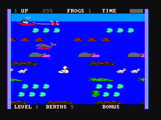 On its original platforms, Frogger II: ThreeeDeep! presents simple but charming pixel art that clearly distinguishes each hazard and safe zone. The underwater sequences feature deep blues and greens, giving a sense of murky danger, while the above-water stages burst into brighter hues that highlight logs, lily pads, and the occasional seagull. Despite hardware limitations, each sprite remains readable, and the color contrast helps you quickly identify threats and safe spots.