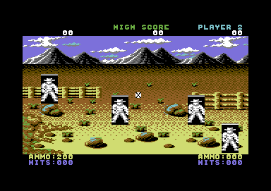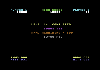 Animations are simple yet purposeful. Targets appear, flicker, and drop in a satisfying manner when hit, giving immediate visual feedback that aligns perfectly with the sound effects. The Magnum Light Phaser adds another dimension: recoil animation and muzzle flashes feel surprisingly dynamic for a C64 title. These little touches keep the action feeling alive, even when you’re standing in front of a CRT monitor with a plastic gun in hand.