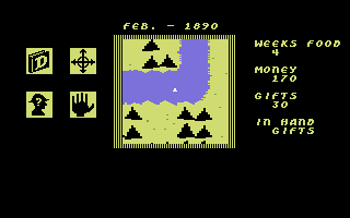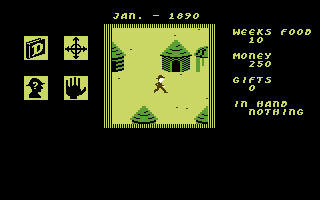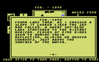 The adventure unfolds through a top-down exploration window where you guide your character with the joystick and interact via the fire button. A set of four icons—Diary, Map, Options, and Hand—allow you to pore over Hiram Primm’s unpublished notes, track your cartographic progress, stash supplies in hidden caches, and use inventory items. Managing delirium is another layer of challenge: if your explorer becomes dehydrated or malnourished, controls may invert or respond erratically, underscoring the importance of self-care in the field.