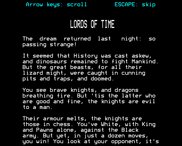 Lords of Time offers a richly rewarding journey for players who relish classic interactive fiction. The combination of varied puzzles, atmospheric text descriptions, and a unifying time-travel storyline results in an adventure that feels greater than the sum of its parts. While the lack of graphics may deter those seeking a visual spectacle, the depth of the writing and the clever puzzle design more than compensate.