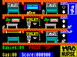 Mad Nurse puts you in the white shoes of a trainee midwife whose primary task is to keep a horde of mischievous babies alive. Each infant makes a break for freedom from its cot and scampers across one of three floors in pursuit of danger—be that an open lift shaft, electrical sockets or stray medicine bottles. Your job is simple in concept: chase down any runaway baby, scoop it up and return it safely to its cot before harm befalls it.