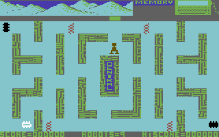 Transitioning into the second stage, the gameplay shifts into a maze-clearer reminiscent of classic arcade hits. You control Zog, a small cleaning robot tasked with wiping up patches of oil scattered across a vibrant circuit-board grid. The pacing is more methodical here, encouraging route optimization to clean every spot efficiently. Adding to the excitement, three chip sprites dart freely around the maze, while resistors patrol vertical columns, forcing you to weave between hazards and time your movements carefully.