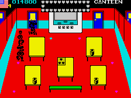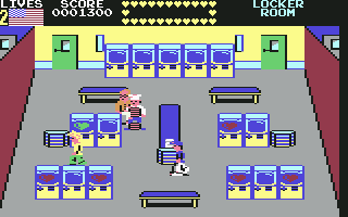 Enemies such as the strict teacher, the resourceful chef, and the lumbering janitor patrol the classrooms, each presenting a distinct threat. The teacher is particularly menacing; when provoked, he not only chases you but eventually hurls his dentures in a frantic attempt to stop your romantic quest. Later stages introduce throwable objects—basketballs in the gym and chickens in the canteen—that can temporarily stun foes, injecting a dash of strategy into your shouts and evasions.