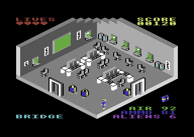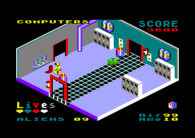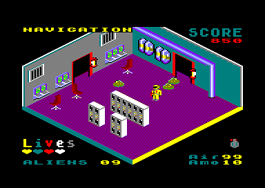 The introduction of wandering robots adds a clever twist to the established formula. When shot, these machines drop cells that can replenish NEIL’s ammo, restore his life support, or unleash a devastating smart bomb that wipes out every alien in the room. Deciding whether to use a cell immediately or save it for a particularly dire encounter becomes a recurring strategic choice.