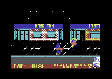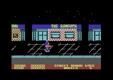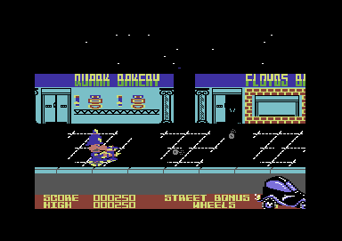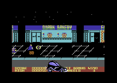 The challenge ramps up as robbers become faster and more unpredictable, rolling bombs in your direction that you must dodge with careful timing. Missing a beat means losing one of your four precious lives. Meanwhile, punks emerge from side alleys, ready to take a swing at you. You can club them for bonus points, but getting too aggressive increases the risk of a collision. This risk–reward balance keeps players on their toes, blending reflex-based action with strategic positioning on the narrow street.