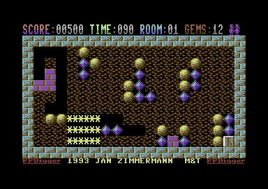 P.P. Digger faithfully recreates the classic Boulder Dash experience, tasking players with guiding an adventurous digger through a series of underground rooms to collect the required number of diamonds before time expires. Each level unfolds as a cleverly designed puzzle, where every block of earth you remove can alter the course of the next few seconds. The rockstones, or “boulders,” perched upon the soil are the game’s centerpiece: if you undermine the earth beneath them, they’ll crash downwards, reshaping pathways and creating new routes to explore.