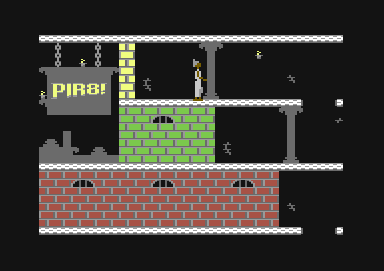 Pir8! delivers a surprisingly deep platforming experience considering its tiny 2 KB footprint. You guide your protagonist through the dimly lit corridors of a cellar, using the joystick to move left and right and the fire button to jump. The controls are instant and responsive, which is essential when you’re making pixel-perfect leaps across narrow ledges or timing your climbs on crumbling walls.