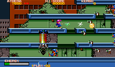 On arcade hardware and home ports alike, Psycho Soldier maintains a steady frame rate even when multiple projectiles and enemies crowd the screen. Occasional flicker is inevitable given the era’s limitations, but overall performance remains reliable. The UI is clean and unobtrusive—your energy meter, life count, and power-up icons stay tucked in corners, so the playfield feels open and uncluttered.