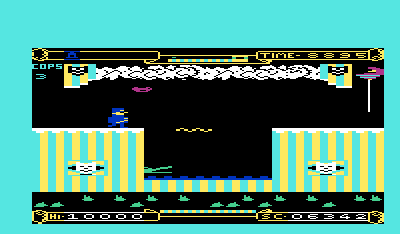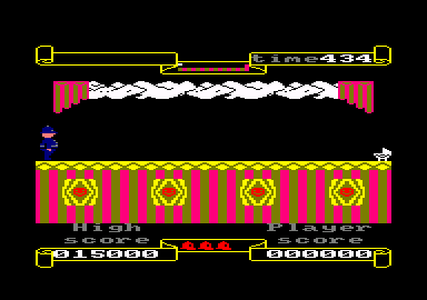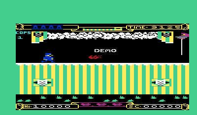 For an early-’80s release, Punchy’s visuals are delightfully colorful and evocative of a bustling theater. The background art depicts velvet curtains, wooden stage floors, and elaborately painted set pieces that change from act to act. While sprite sizes are modest by modern standards, Bobby’s distinctive hunch and the exaggerated features of each hazard hitter—the menacing crocodile jaws, the squishy custard pies, and the comical tomato splats—translate clearly on screen.