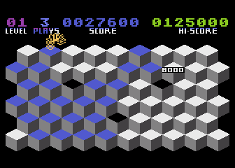 Alongside preserving your five lives, maintaining a healthy point total is crucial. Every jump chips away at your score, and taking a hit costs even more. Bonus icons worth 8,000 points appear fleetingly on certain squares, forcing you to strike a balance between methodical coverage of each block and opportunistic grabs of these high-value targets. This push-and-pull keeps every stage engaging and encourages players to refine their routes.