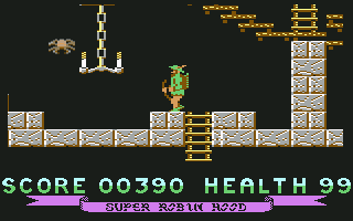 Super Robin Hood presents a classic flick-screen platformer challenge that demands precision and timing at every turn. You control Robin as he hops between ledges, ducking under guard darts and leaping over crawling spiders. The controls are straightforward—left, right, jump—but the tight hitboxes mean a single misstep, a stray projectile, or a long fall can drain a chunk of your energy bar, making each move feel consequential. With an initial health pool of 99 points, the game strikes a balance between generous longevity and the constant tension of avoiding damage.