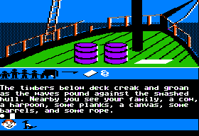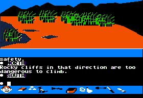 The user interface is clean and uncluttered: a prompt line for commands, a descriptive window for narrative feedback, and a side pane for quick-reference messages. When you access the mapping system, simple ASCII symbols delineate trees, beaches, and rock formations—effectively conveying terrain without taxing sluggish hardware. The result is a consistent, distraction-free reading experience that feels more like interactive storytelling than a traditional “video game.”