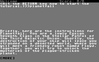 Planetfall’s bite-sized preview introduces a lonely science officer stranded on a deserted starbase—and the ever-adorable robot companion, Floyd. In a few lines of text, you sense the loneliness of deep space travel, the urgency of survival, and the budding friendship that characterizes the full game’s emotional core.