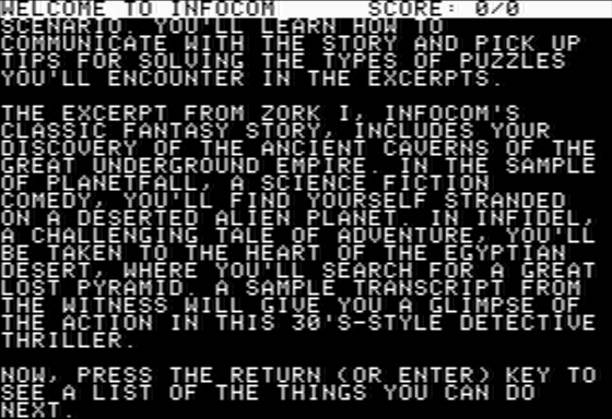 The Four-in-One Infocom Sampler delivers a highly cost-effective way to sample four legendary titles without investing in full games. Priced around $10, it functions as a “try before you buy” package: you can either return it for a full refund or apply the cost as credit toward any of the four complete releases. In practice, this means you pay nothing to experience the demos.