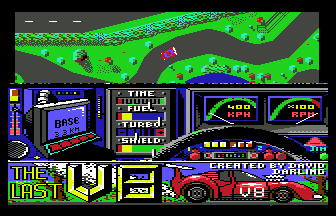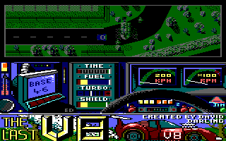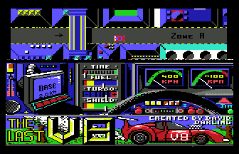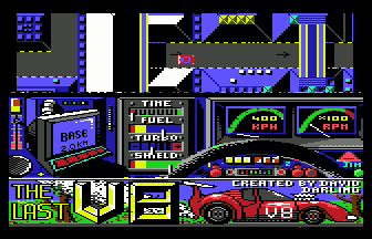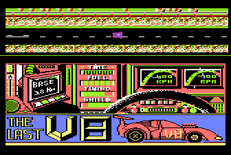 On systems without the C128’s enhanced palette, colors are more subdued, but the contrast between road, obstacles, and background remains effective. Animation is straightforward yet fluid—your V8 darts around corners, skids on loose surfaces, and responds instantly to your inputs. All in all, the graphics may not rival modern titles, but they serve the gameplay superbly and reinforce the game’s relentless pace.