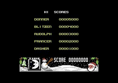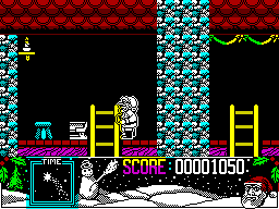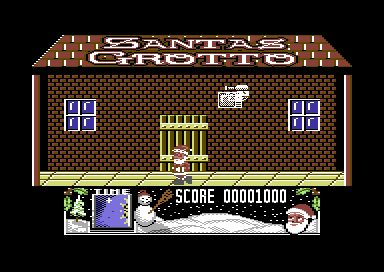 The Official Father Christmas offers a multi-stage gameplay loop that begins the moment you enter your name, setting a warm and personalized tone. In the first stage, you navigate a flip-screen home environment to collect scattered pieces of Santa’s sleigh. This introductory segment combines light puzzle elements with a timed challenge, as each item you carry can be dropped if you collide with one of the mischievous elves patrolling the screen. Recovering lost pieces adds a playful frustration, encouraging careful planning of each route.