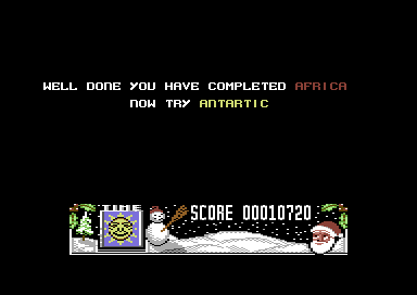 The Official Father Christmas features charming, pixel-art visuals that capture the cozy spirit of Christmas Eve. Character sprites are colorful and distinct: Santa’s bright red suit pops against the snowy white backgrounds, while the elves’ green outfits add festive contrast. The flip-screen home level is adorned with warm tones and decorative details like stockings and wreaths, creating an inviting hearthside atmosphere.
