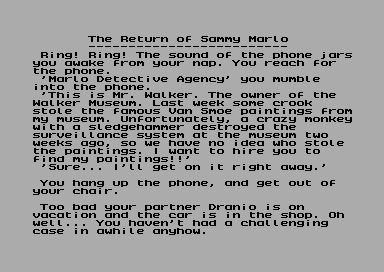The Return of Sammy Marlo puts you directly into the shoes of the wise-cracking private eye, Sammy Marlo, as you work to recover a room full of priceless paintings stolen from the local museum. The text-based interface relies on classic text adventure commands—look, examine, take, talk, and so on—inviting you to think like a detective. As you interview suspects and scour environments, you’ll need to piece together clues from seemingly mundane details: the whiff of old cheese, the jingle of a bus’s bell, even the static hum of used electronics. The parser is forgiving enough to keep you moving forward, yet precise enough to reward thoughtful phrasing.