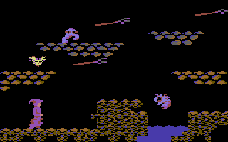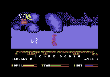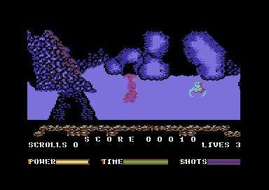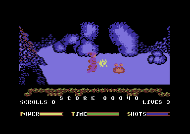 The first three levels are set in a labyrinthine cave network, employing flip-screen sideways motion and subtle in-and-out screen shifts. Each stage challenges you to locate four scrolls and a unique magic object—a wand, a silver broom, and finally a winged helmet. Time limits and a finite number of lives add urgency, though extra lives and time extensions can be uncovered if you thoroughly explore each chamber.