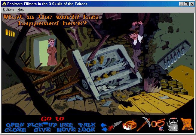 3 Skulls of the Toltecs embraces the classic point-and-click adventure style popularized by LucasArts in the early ’90s. Players control Fenimore Fillmore through a simple verb-based interface—open, close, pick up/give, use, look, move, talk—selecting actions by clicking on objects and characters in richly detailed scenes. This familiar setup makes it easy to jump into the game, yet the puzzles remain cleverly designed, requiring a careful combination of item collection, dialogue choices, and environmental interaction.