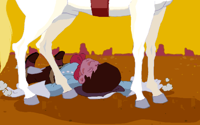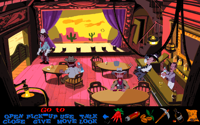 Background art is packed with small details—from rattlesnakes coiled in the brush to dusty wanted posters flapping on saloon walls—rewarding patient viewers who like to click every hotspot. Animations are fluid for their era: drinking from a flask, pumping the trolley, or reloading a shotgun all convey personality. The UI frames and verb menu are unobtrusive, letting the visuals shine without distraction.