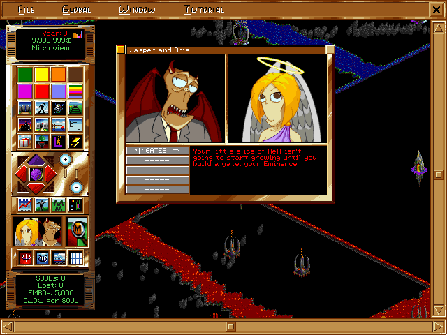 While the game’s age shows in some lower-resolution textures, the overall art direction remains timeless. The humor shines through in the small details: grinning cherubs tossing coins, impish demons sharpening pitchforks, and cheeky tooltip messages that keep you smiling even as you juggle competing priorities.