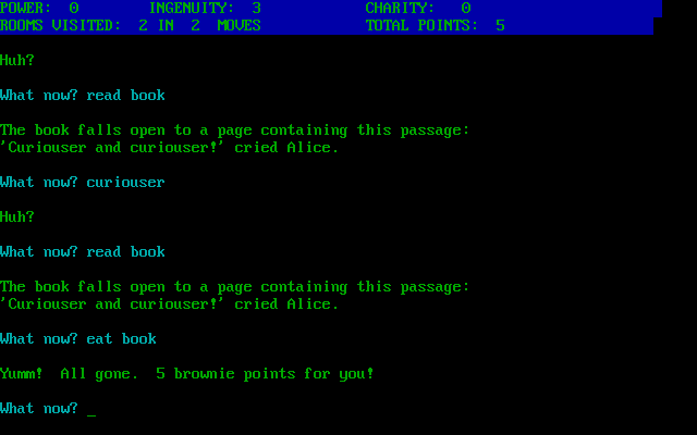 The core of Alice in Wonderland’s gameplay lies in its faithful implementation of classic text-adventure mechanics. As Alice, you navigate Wonderland one room at a time, issuing simple two- or three-word commands to examine objects, interact with creatures, and traverse hidden passages. The parser is robust enough to understand most logical commands, yet it still rewards players who experiment with synonyms or unconventional phrasing, preserving the sense of discovery that defined early interactive fiction.