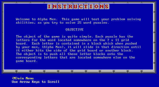 Alpha Man centers on a deceptively simple yet deeply challenging sliding-block mechanic. Across 25 distinct word puzzles, you control the titular character—Alpha Man himself—as he pushes letter-laden blocks around a 7×11 grid. Once pushed, each block slides in a straight line until it collides with either the edge of the playfield or another block, requiring careful planning of every move.