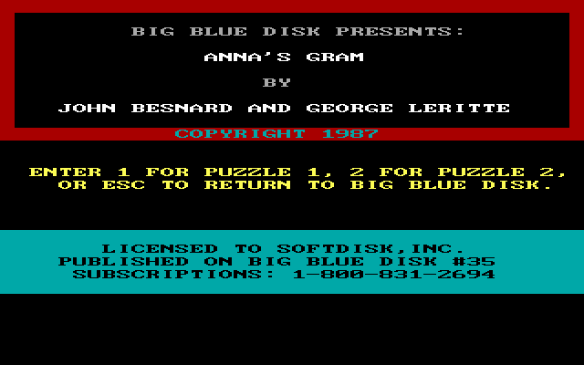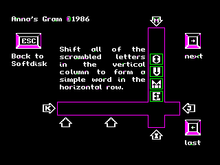 Built on the modest hardware of Softdisk’s early platforms, Anna’s Gram embraces a clean, uncluttered visual style that prioritizes function over flair. Letter tiles are rendered in crisp, high‐contrast font, ensuring readability even on low‐resolution screens. Grids, borders, and UI elements are straightforward, guiding your attention squarely to the puzzle at hand.
