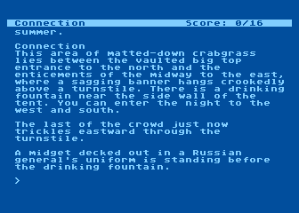 Although Ballyhoo is rooted in the Commodore 64 era, it surprises with detailed ASCII art representations of key locations. Each circus ring, canvas tent wall, and backstage corridor is sketched with enough flair to spark the imagination, turning simple character blocks into a vivid carnival setting. These minimalist visuals complement the text’s descriptive passages, allowing you to fill in the rest with your own mental imagery.