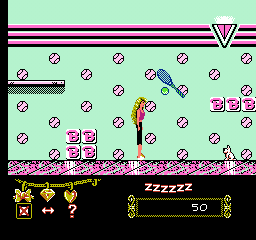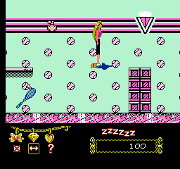 Central to the action is Barbie’s ability to jump with the A button and hurl magic crystals using the B button. Holding down B charges the throw, allowing you to adjust range and timing. The three different crystal types—one that persuades creatures to assist, another that defeats foes outright, and a third with unpredictable effects—add a light layer of strategy. Deciding which crystal to use and when can mean the difference between a smooth run and an untimely “game over.”