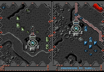 Sound effects are similarly era-appropriate: chunky laser blasts, tracked vehicle rumble, and brief radio chatter punctuate each engagement. A looping MIDI soundtrack blends driving percussion and synth pads, reinforcing the cold, tense feel of warfare on a moon base. Though far from modern audio fidelity, it helps maintain immersion without overwhelming the strategic flow.