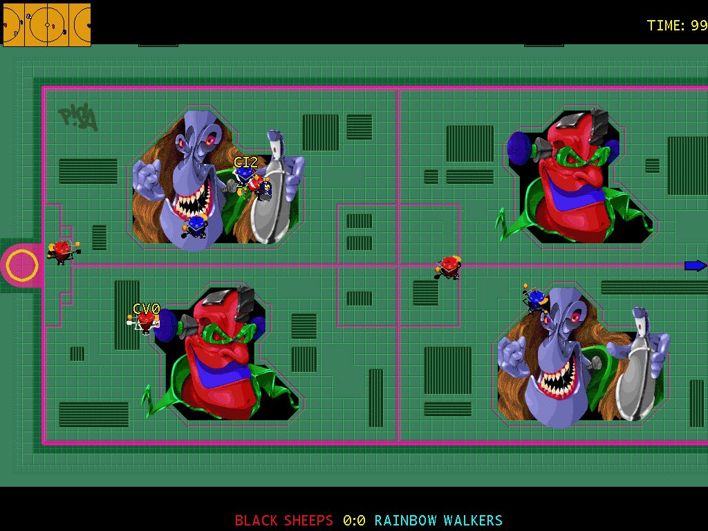 Visually, Bot Soccer leans into retro charm with clean, colorful sprites and a straightforward top-down perspective. Each robot design stands out: spider-like legs, tank treads, and sleek humanoid frames are all rendered with crisp pixel work. The playfield is clearly marked, and you can instantly distinguish teammates from opponents even in the thick of action.